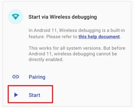 使用无线调试来启动针对Android 11及以上版本的设备。这种方式不需要连接电脑。但由于系统限制,每次设备重启后都需要重新设置一次。
