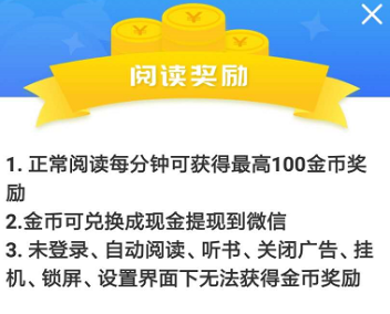 3.未登录、自动阅读、听书、关闭广告、挂机、锁屏、设蓝界面下无法获得金币奖励