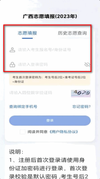 需要输入考生报名号等相关信息来登录后即可进行志愿填报使用。