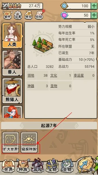 进入游戏后,玩家可以点击起源下方的随机事件,以提升种族的战力和人口等属性。
