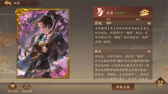 点评:“七 阴”之一,百变女王。赵襄是唯一推荐的祈福(万符)武将,其武将强度和游戏体验感绝对是顶级的:4血3技能,每局游戏技能搭配都不一样:【父魂】+【强识】的永动组合,【奔袭】+X也能瞬间上天;即使是不起眼的【无言】+【再起】也能让赵襄成为不死之身,强烈推荐新手将赵襄做为自己的第一个豪将!