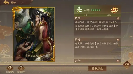 点评:身份局中的“最强常备主公”,其他身份也不弱。前期发动【残蚀】一口气摸10来张牌,体验感爆棚!单挑时至多摸4张牌强度有所下降,但是孙皓本身5血,已经超越绝大多数武将了。