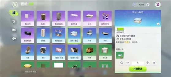完成主线节点后会出现小淡水鱼缸的支线节点,这个鱼缸需要收集五个沙子才能建造,而沙子可以到附近的海滩收集。完成建造后在家园里摆放。