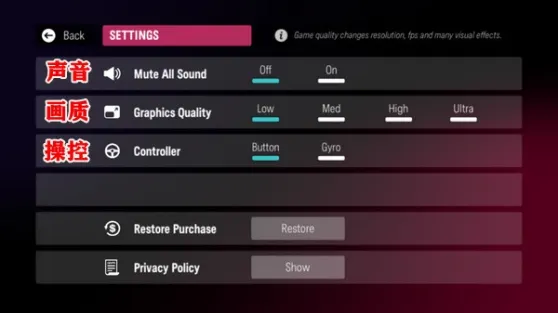 2、现在还没有中文设置,只有声音、画质、操作几个选项,手机好的可以把画质拉满