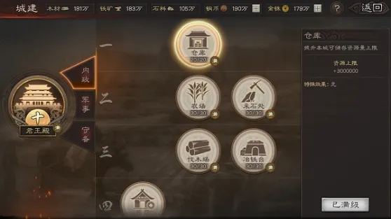 【敲黑板备注】四大资源都可以爆仓,在8级君王殿之前,把主线任务所需的资源等级点到位就可以0.8级君王殿之后,优先完成支线任务,之后四大资源看自己的实际资源数,缺什么点什么,20级屯田获得量增加可有可无,因为点的越高耗费资源越大,有可能你升级一点资源,结果要补好几个小时才能补充回来,这在前期是很致命的。