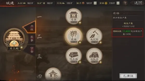 2)农场:提高粮食产量(与领地资源无关,自己城里产的),点到20级屯田获得量增加50%