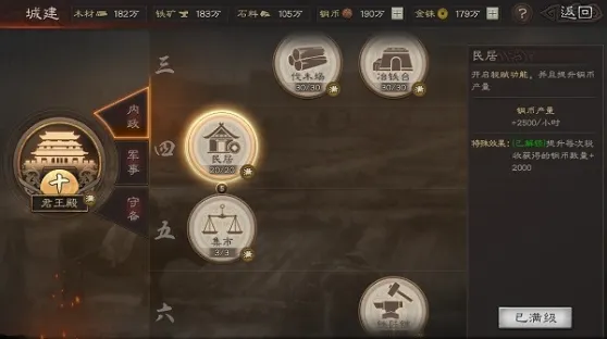 6)民居:提高铜币产量,点到20级每次收税多获得2000铜币