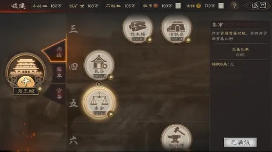 7)集市:可以在主接口政厅里的贸易功能里交换资源,等级越高,交易比率越高