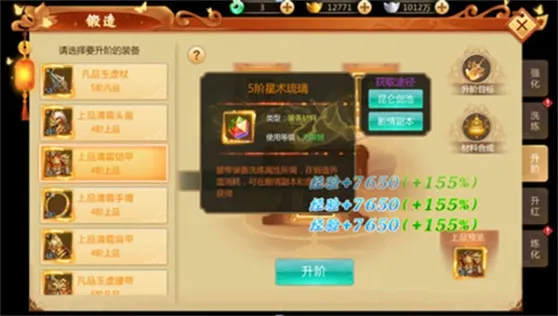 所有装备均可使用材料升级为高阶高品装备。随着装备升阶,装备的属性提升,战力变强