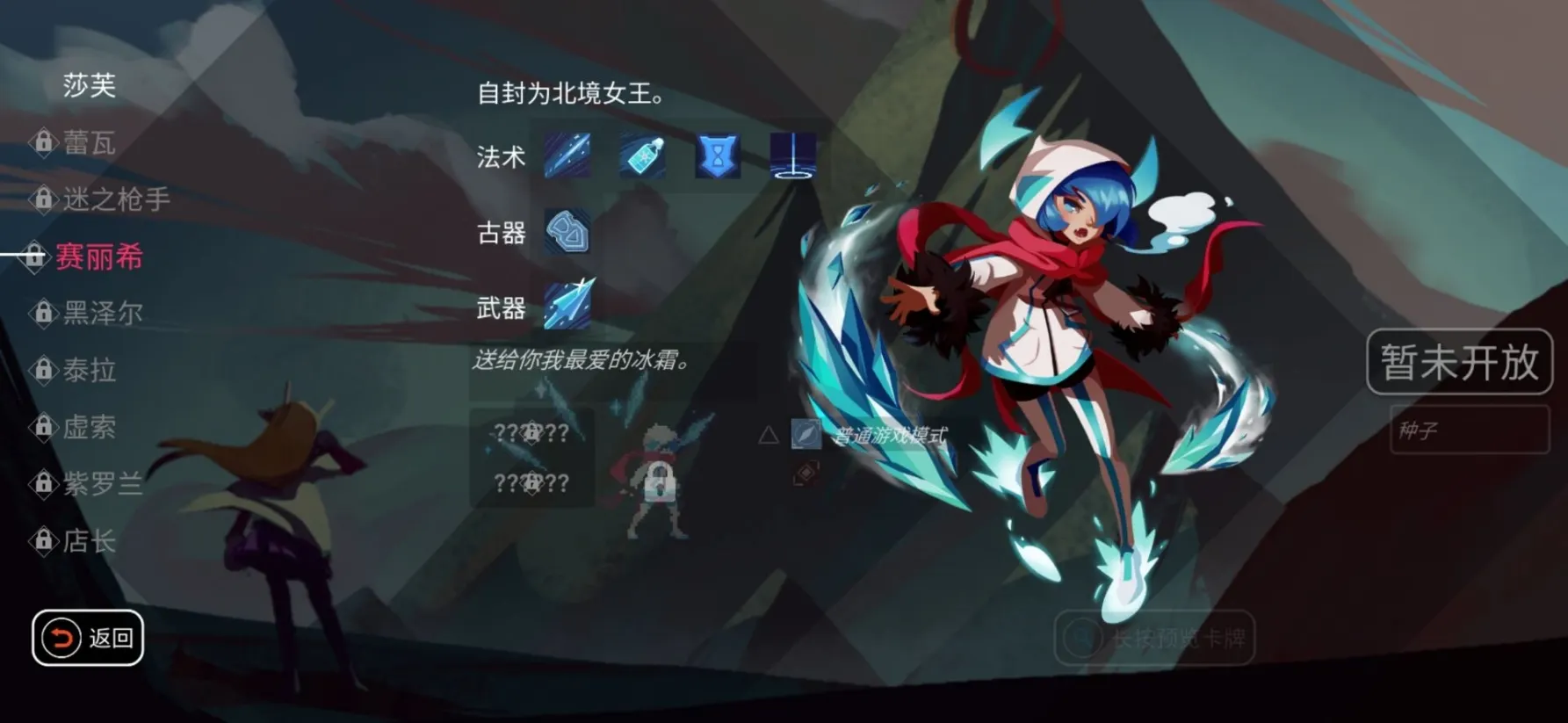 第三个角色老咸鱼选择介绍赛丽希。赛丽希是一位自封来自北境的女王,擅长使用冰冻术来进行攻击。解锁赛丽希的方式为通过第三关或以上关卡时击败后即有机会获得。