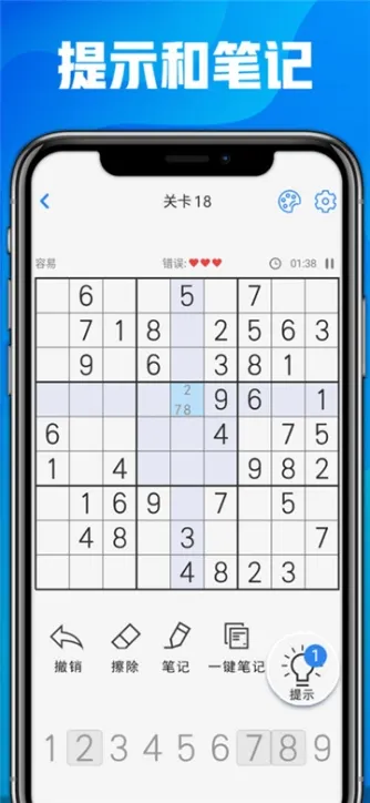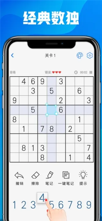 数独九宫格是一款极具挑战性的单机游戏。这款游戏以传统的数独玩法为核心,要求玩家在每一行和每一列中排列1至9的数字。请注意其中的规律,建议从简单的开始,以便更快掌握游戏规则,并将所有方格填满数字。感兴趣的玩家快来下载数独九宫格的最新版本吧。