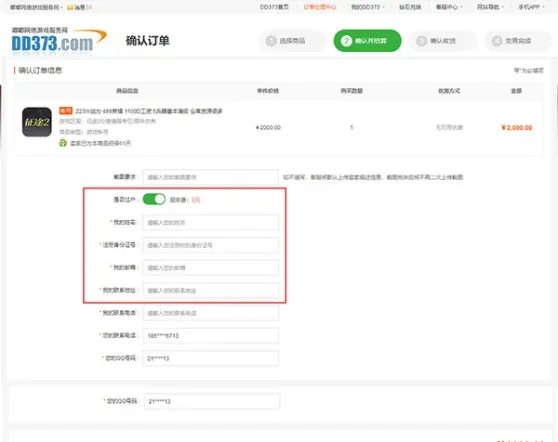 2、在确认订单页面,支持过户的商品,显示过户服务开关。