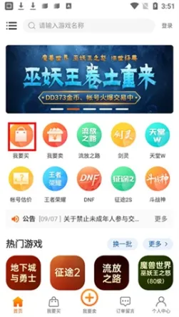 1、打开DD373游戏交易平台手机客户端,在首页有各类的手游交易功能,我们选择我要买;