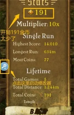 4、进入游戏后,比如说是“神庙逃亡”,那我们现在看到我们的金币有191个,那我们就首先点击屏幕左侧的八门神器的图标,在搜素框内搜索191