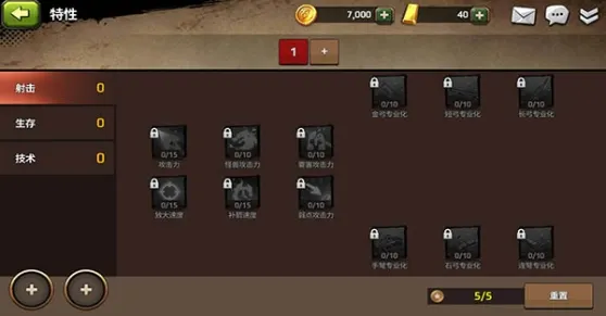 特性分为三大类:射击,生存,技术。
