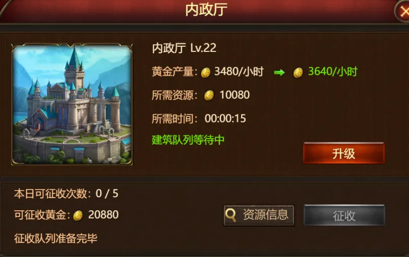 首先是各位领主的内政厅。内政厅的等级决定了其他建筑的上限,所以领主们在升级后的第一件事应该就是升级该建筑。在内政厅中,领主可以定时征收黄金,一天可以征收5次,数量相当可观。