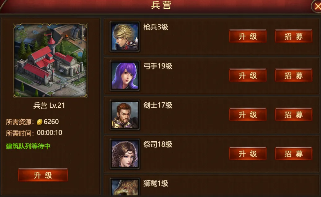 左下角的兵营,升级后可以提升士兵的等级。在兵营到达一定等级后,还可以解锁更强力的兵种。
