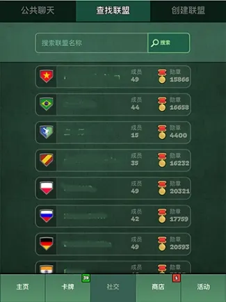 这个界面需要你的账号等级达到3级才会解锁,包含公共聊天、查找联盟、创建联盟三个选项,不过当你加入了一个联盟之后就只有公共聊天和我的联盟两个选项了。加入联盟以后有两个很大的好处,就是协助训练和联盟军需箱,这两个都是对萌新发展帮助很大的功能。