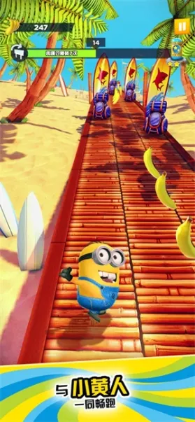 小黄人快跑的中文版属于那种跑酷类的休闲手机游戏,它的玩法跟地铁跑酷差不多,有三条道路,玩家能够操纵小黄人在这三条道上随便切换。跟地铁跑酷相同,不存在时间方面的限制,玩家能够不停地获取香蕉,有了香蕉后,就能给小黄人换穿新衣裳啦。