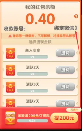 此外关键的红包提现功能是需要在线活跃天数满多少天能提现多少,而且注意只能绑定一个微信号哦,还有就是无条件提现是需要满足红包累积200元的哦