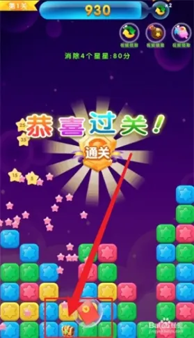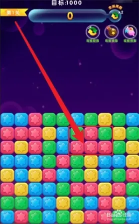 第一关的通过分数是1000分,但是在第一关需要赚取3000分,才可以笑到最后,把基础打好。首先,在消除星星的时候先看一看是否有多个连接在一起的,有的时候,自己找不到消除那个星星,系统会给个提示。