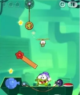 3、割断糖果上方的绳子,让糖果摆动到左边打开机关并吃掉最左边的星星。