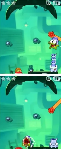 1、割断第一颗惊吓球把小怪兽弹起来,在小怪兽吃掉星星的时候点击下边的石头怪吐出绳子接住小怪兽。