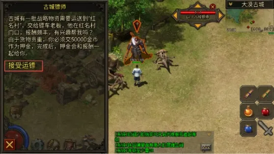 4.勇士们到了28级之后就可以在古城镖师NPC(坐标490,306)处去领取押镖任务,新人不知道在哪里的可以点开右上角大地图,在右边NPC栏里面滑动找到古城镖师点击自动寻路。