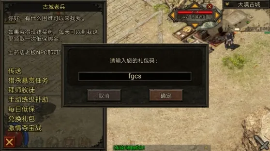 1.各位勇士在新手村达到15级之后,会自动传送到大漠古城,到了古城首先去安全区左下角(坐标293,352)处找古城老兵领取散人福利:论坛礼包,礼包里面有回城石,随机石,书页,喇叭。礼包码为:fgcs