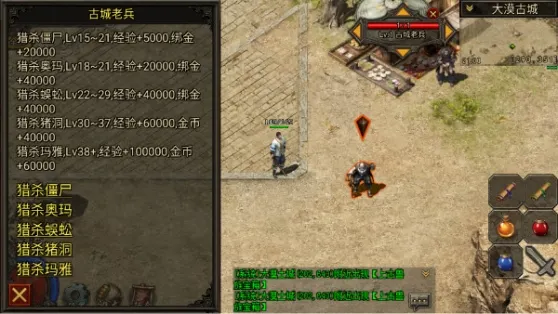 5.各位勇士们到了31级之后,在武器铺老板处领取金矿任务,3个金矿换5000经验.7个金矿换2万经验,15个金矿换4万经验,每天一次