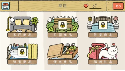 商店是《萌宅物语》唯一消费的地方,目前游戏时间不长,还没有获得很多爱心解锁花园,卧室,浴室。