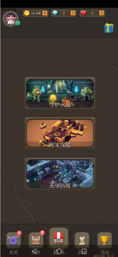 3、玩法多样,目前有注重BD的守护水晶玩法,玩家需要抵御20波怪物的入侵,守护水晶不被打破;也有注重探索走位策略的地牢探险,玩家需要判断房间走向,躲避机关,利用场景元素击杀怪物;还有验证自身实力的无尽历练,高达99999波的怪物让你明白自身实力处于哪个层次。