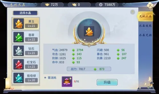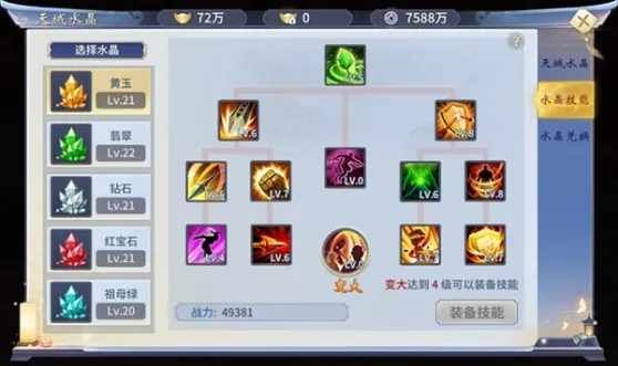 下面为大家讲讲怎么玩好水晶的天赋技能。在天域水晶玩法中,玩家一共5个不同的水晶,分别为黄玉、翡翠、钻石、红宝石、祖母绿,每个水晶可以使用水晶碎片进行升级冰增加战力,最大升级50级。水晶等级越高,可以在水晶技能天赋中学习越高级的技能,不够等级时无法进行技能学习。