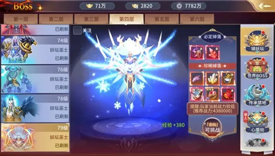 需要注意的是从第3层开始,要挑战BOSS需要玩家的仙职达到指定职位才可进入,第3层需要【地仙】、第4层需要【金仙】、第5层需要【仙王】、第6层需要【圣皇】。仙职需要玩家完成各种任务来提升。