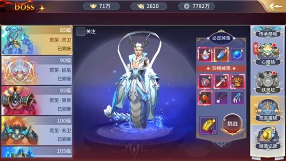 荒芜魔境是一个对玩家实力要求最严格的BOSS玩法,最低级的boss都要65级,且进入挑战需要消耗1个【神力印记】,【神力印记】只能在【传说仙境】挑战仙境至尊boss有概率获得,可以说不是人人都能参与该boss玩法的哦。