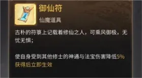 2、成仙会给“御仙符”这个道具,效果为:使自身受到其他修士的神通与法宝伤害降低5%,可减伤。