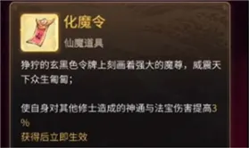 3、入魔会给“化魔令”这个道具,效果为:使自身对其他修士的神通与法宝伤害提高3%,可增伤。