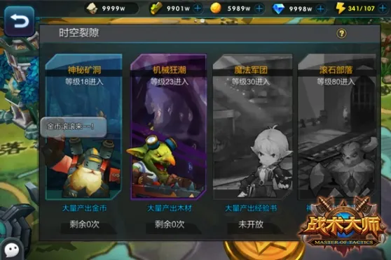 当玩家达到15级的时候,在试炼的界面内,时空裂隙便会开启,其内有四个日常副本,通关后即可获得大量,金币、木材、经验书等大量资源,这些资源无论是对于大R还是平民玩家,都是一笔绝不能错过的资源积累。