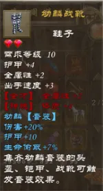 5、蛮皮甲:加攻击还吸血,很好的初期装备,没有勇士甲看替代使用,尤其给太史、赵云、关羽之类的武将使用效果不错,没有装备的情况下甚至都可以考虑给贾诩用。
