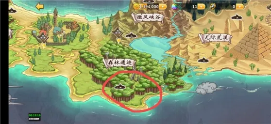 那这时候我们该怎么办呢,这时候我们就要重视起我们进入游戏一来一直被我们所忽略的一样东西,如下图中标识的小圆圈,点击它可进行远征,森林遗迹的远征可以帮助你获取必不可少的花岗石。