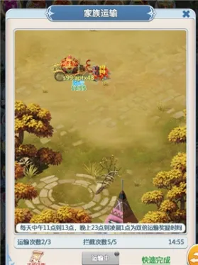 每天可以和家族的小伙伴一起进行家族运输,同时还可以抢夺其他家族成员运输的马车!成功抢夺后可以获取海量福利,请务必守护好自己的马车哦!不过自己家族的成本的马车也可以抢,所以千万不要抢错哦。