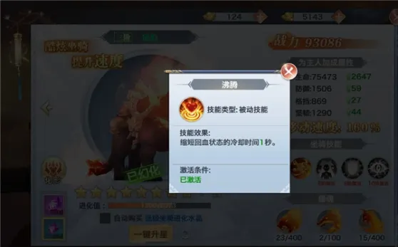 坐骑可以通过消耗两种坐骑进化水晶获得进化值而且还有机率获得多倍进化值,进化值满即可提高星数加成属性;当前阶级坐骑满星即可成功进阶,解锁全新形象,并提升移动速度。