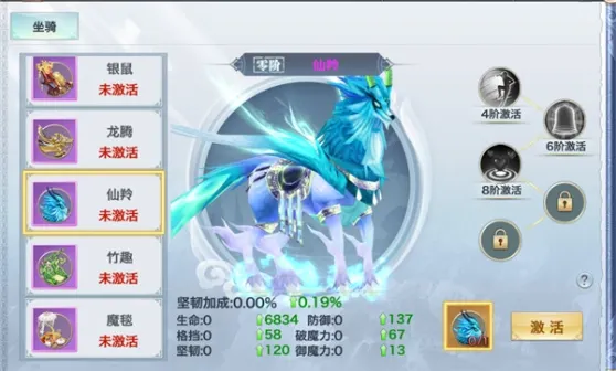 游历世间,当然少不了异兽坐骑来代步驰骋。坐骑除4项基础属性外还额外增加移动速度,同时根据不同阶级解锁被动技能,为玩家提供持续性BUFF。玩家达到30级开启坐骑功能,点击主界面【骑宠】即可进入选择坐骑界面。