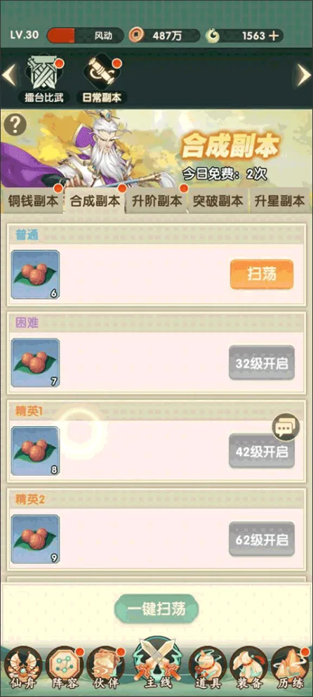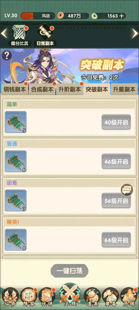 进入日常副本界面就可以看见有五种玩法:铜钱副本、合成副本、升阶副本、突破副本、升星副本
