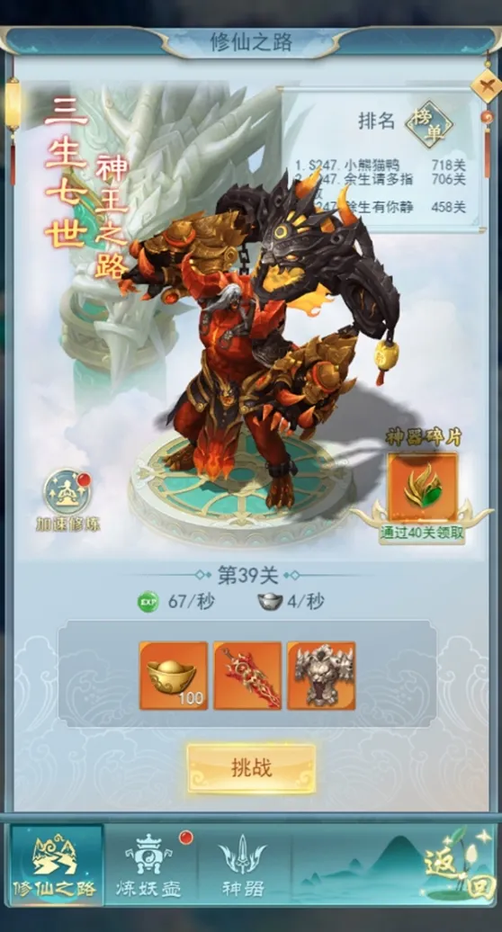 游戏的主线分为2种,分别是主线任务和关卡挑战,两者都可以获得大量的经验哦。同时通关主线关卡还可以获得神器碎片,集齐神器碎片之后就可以激活神器,进一步提升战力。