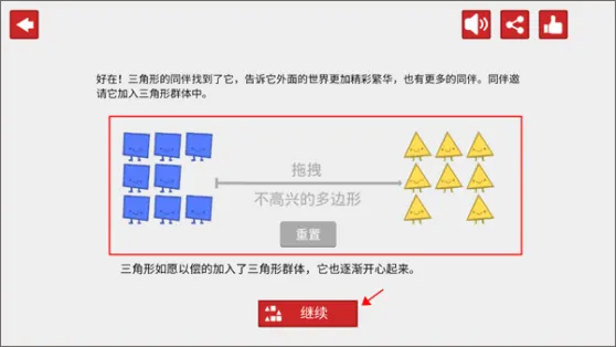 3、图形们因为身边其他图形的不高兴而导致图形社会动荡,拖拽不合群图形,使每个图形都高兴起来。每个图形移动1次,步数就会增加1。