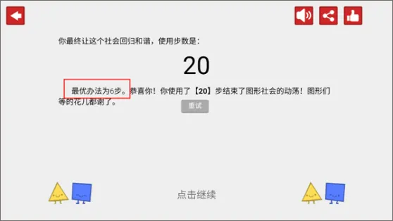 4、当你最终有非常多的步数才能让图形社会变得安宁,你就会发现图形们已经等得不耐烦了。最优办法为6步,所以就需要你用最少的步数让图形们变得安静。