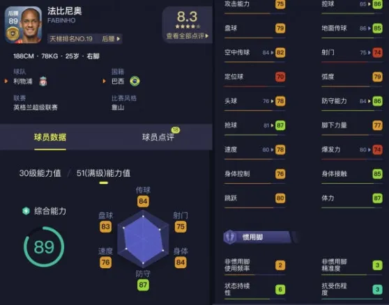 接下来要说的是利物浦去年刚刚签下的神腰法比尼奥,克洛普对法比尼奥有这样的评价:“法比尼奥是一名优秀的传球手,速度很快,擅长拦截,是一个理想的防守型中场,他的技术也很好,并且带着脑子踢球,他的能力和心态能让他在不同位置上表现出最佳水平”。法比尼奥无论是在摩洛哥还是利物浦,他稳定的状态和果断的防守都给大家留下了深刻的印象。游戏中,他满级达到了89分,无论是控球86分盘球79分,还是双传85、82分。还有双速78、74分。数据非常均衡是标准的六边形。同时188的身高和85的身体接触给了他充分的身体保障。防守能力和抢断也达到了86和87。无论是助攻还是盯防还是抢断都有良好的表现。适合防守技术好希望更多进攻机会的玩家使用。下赛季会升到黑球