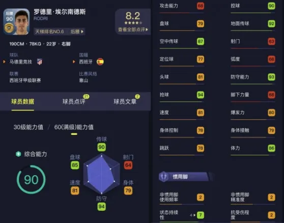 由于上赛季在马竞的出色表现,罗德里在今年夏窗被曼城相中,以曼城队史第二高引援的记录被签下。作为马竞铁血防线中的一员,罗德里表现突出,之前2500万身价加入马竞,一个赛季身价即突飞猛进。同时他只有22岁,实力和潜力都毋庸置疑,相信他在瓜帅手下可以继续发挥他的优势,成为曼城后防线最关键的一环。游戏中,他满级达到了90分,最突出的能力是他的防守、传球和盘球。其中防守能力达到了93分、抢球达到了94分。绝对是中场顶尖的防守能力,甚至不输一些黑球中卫。加上92和87的双传,无论是助攻还是回敲都有很强的能力保证,同时还有90的控球,有很强的护球能力。而速度方面评分都在80左右,还算可以。罗德里的后腰关键数据都非常不错,手感方面,防守能力极强,但是和布教授一样,转身速度不是太快。所以在使用时要注意对方前场逼抢时需要看清对方逼抢方向在进行转身,这样更加稳妥