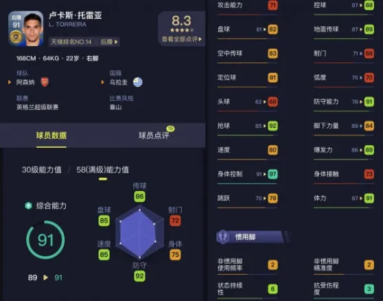 目前效力于阿森纳的卢卡斯托雷亚,身高1米68,司职后腰,在17-18赛季在意甲桑普多利亚由前腰转型为后腰,代表球队在联赛中出场36次,打进4球。18年转会到阿森纳,同年7月2日对阵托特纳姆热刺的比赛中,第78分钟托雷拉打进阿森纳生涯首球,帮助球队4-2取胜。赛后托雷拉被天空体育评为全场最佳球员。全场比赛托雷拉共有68脚触球,48次传球成功43次,12次抢断成功。在攻防两端都有很出色的表现,而且年龄才22岁,所以很多媒体都称他为“下一个坎特”。游戏中他的满级评分达到了91分,其中防守能力达到了91分,抢球达到了92分。断球能力可见一斑,而且他的速度达到了80爆发力达到了89分,无论是追截、盯防都有很出色的速度保障。控球达到了88分、地面传球达到了89分,可以作为反击组织核心给与中前场快速的支援能力。值得一提的时他的身体控制达到了97分,不像一盘的后腰转身笨重,他的转身速度非常快,可以轻易摆脱对方前场压制。但是他的最大的缺点是身体,他的身高仅有168,游戏中的模型较小,身体接触也只有73评分。对抗高大型中锋没什么优势,虽然有靠山技能,但不建议单后腰阵型中使用他